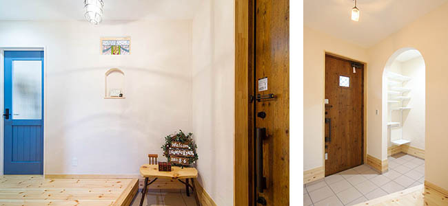 【右:シューズインクローゼット】玄関ホールに収納力のあるシューズインクローゼットを隣接させました。可動棚なので収納するものに合わせて棚の高さを変えられます。
