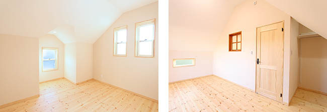 【右:寝室】吹き抜け側に室内窓を設け、お家全体を見渡せるように。天井の低い位置にはウォークインクローゼットを設けて空間をめいっぱい使いました。