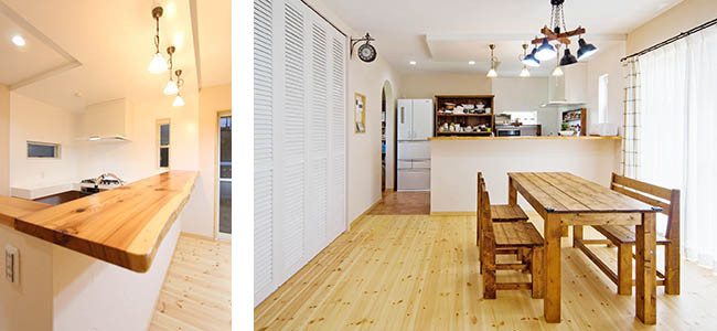 【右:ダイニングキッチン】ダイニングには大きな収納庫を配置し、掃除機などの大きい家電製品なども楽々収納。