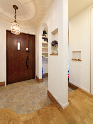 アールを描く玄関は収納力も充実