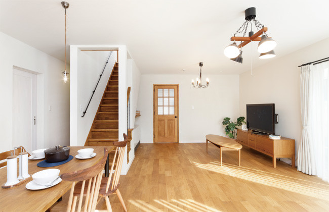 床に無垢フローリング、壁には珪藻土を採用。階段スペースを回遊出来る間取りには十分な収納も。