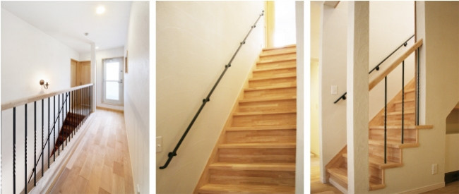 リビング階段の手すりにはアイアンを使い、照明やスイッチも奥様のこだわりの仕様に。