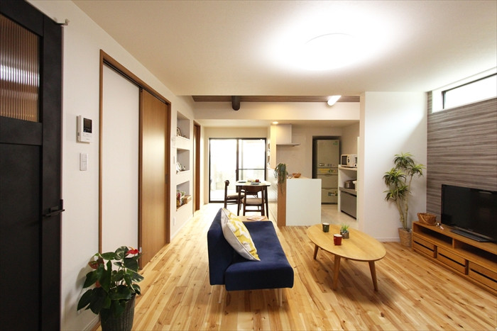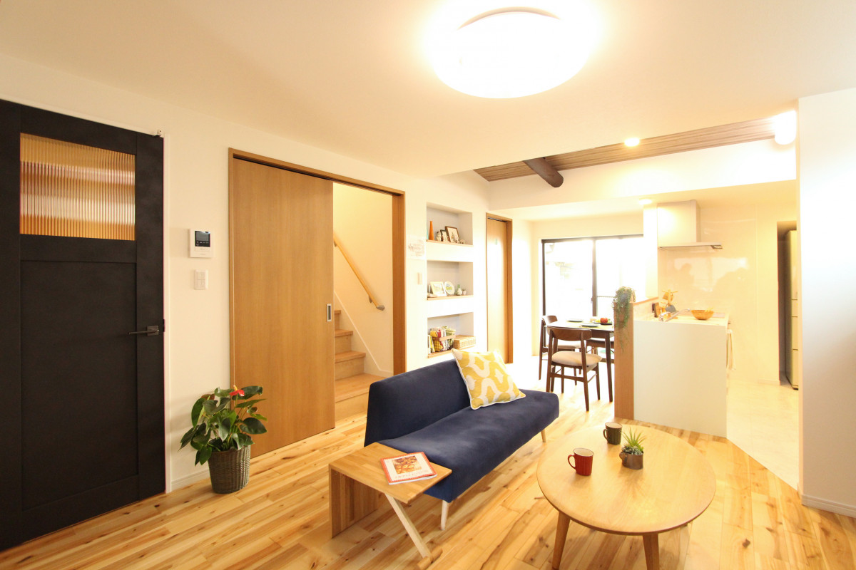 【LDK】和室を繋げて広いLDKを確保し、床には無垢フローリング、内装は白でまとめ、ナチュラルで明るいLDKになりました!ホールからの扉はブラックでお部屋のアクセントに。