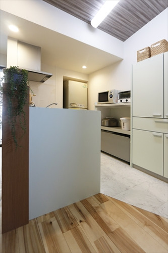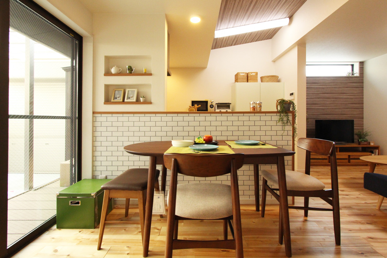 【キッチン】対面キッチンをご提案し、腰壁で囲うことでキッチンの手元を隠しつつ、テーブルへの配膳もしやすくなりました。コンロ前の壁には小物が飾れるニッチも造作しました!