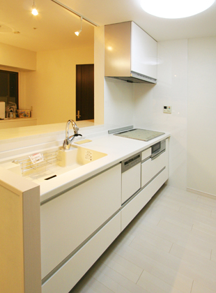 ■施工内容 /キッチン (TOTOレガセス、カップボード)/建具交換/カウンター下収納造作/廊下・LDK・洋室1室 フローリング張替/システム収納 キャビオス取付/LDK壁 珪藻土塗/廊下・洗面・洋室 クロス張替