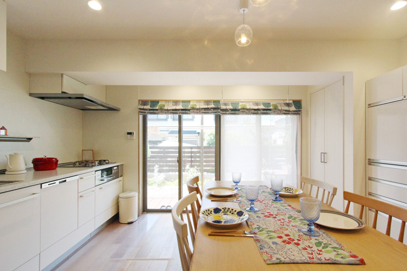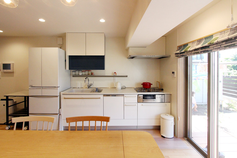 キッチンは対面式ではなくあえて壁付けにすることで、空間を広く使えるように工夫しました!