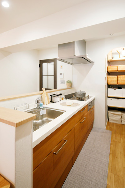 お風呂を大きくしたことでできたスペースを活用し、キッチン横にパントリーを設け収納力アップ。