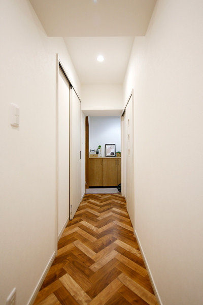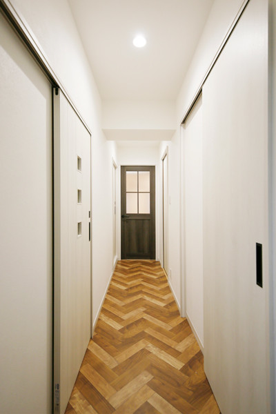 廊下の床材は奥様お気に入りのヘリンボーン柄の床材を使用!