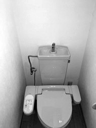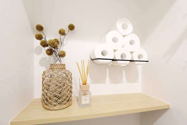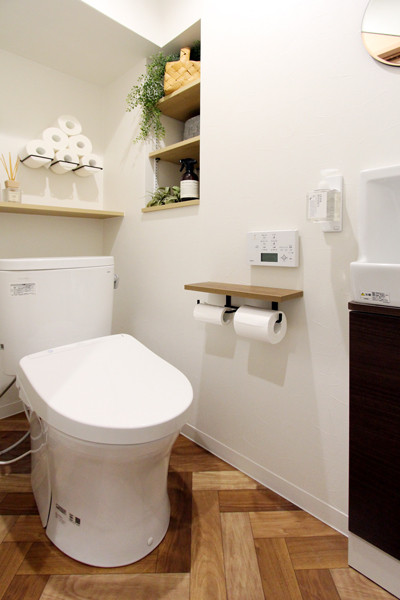 トイレを動かすことで出来たスペースをニッチ収納にし、背面には棚を設けることで収納量もアップ!