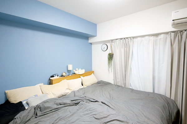 家族みんなで休む寝室の壁一面はブルーのアクセントを!