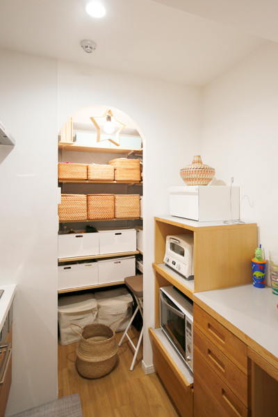 入口はアーチに、内部の壁はヘリンボーン柄にし、かわいいパントリーに仕上がりました!
