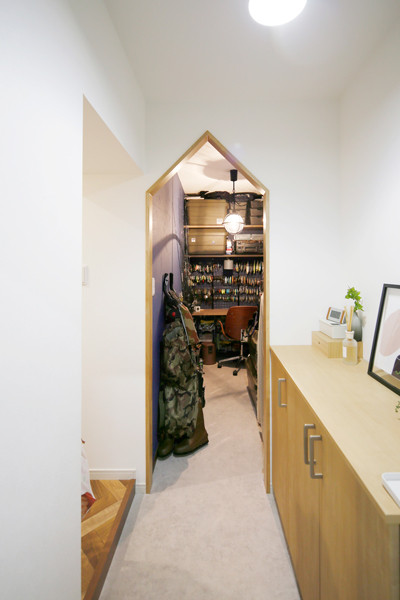 趣味室の入口は三角の下がり壁にし、壁はネイビーのアクセントクロスを。