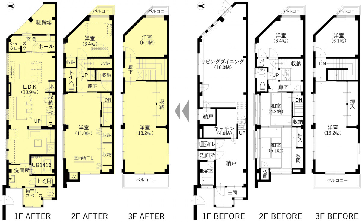 ■施工内容 /キッチン:LIXIL AS L型2100×1950/UB:LIXIL リノビオ 1416サイズ/トイレ:LIXIL ベーシア/洗面ボウル:カクダイ/床:無垢フローリング(LDK・2F洋室・ホール)、フローリング(廊下・洋室)、クッションフロア(水まわり)、タイル(玄関・SIC)カーペット(2F・3F 階段室)/壁:クロス/天井:クロス/洗面台・収納造作/室内物干し取付/建具新調/階段架け替え/駐輪場・ウッドデッキ新設/