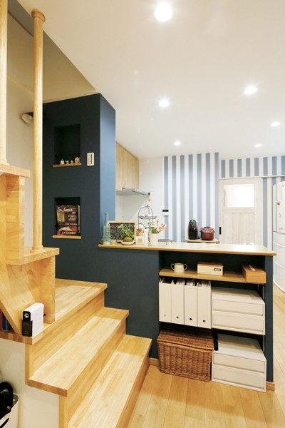 キッチン前は収納スペースにし、書類などをスッキリ収められるように!