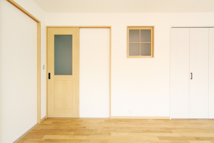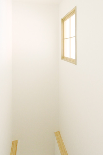 2Fの日当たりが良さを活かし、室内窓と採光のある扉を設けて、階段から1Fに光が届くようにしました。