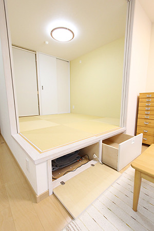 小上がりにした和室の下部には大容量の収納を設けました。季節ものや長物を収納できます。