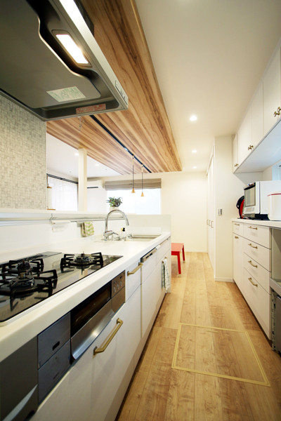 ⽩を基調したシステムキッチンで空間を明るく。