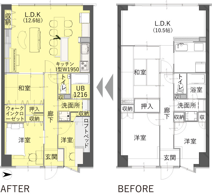 間仕切りを取り払い、キッチンまわりを回遊できる間取りをご提案!便利で広いLDKになりました。