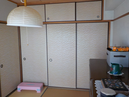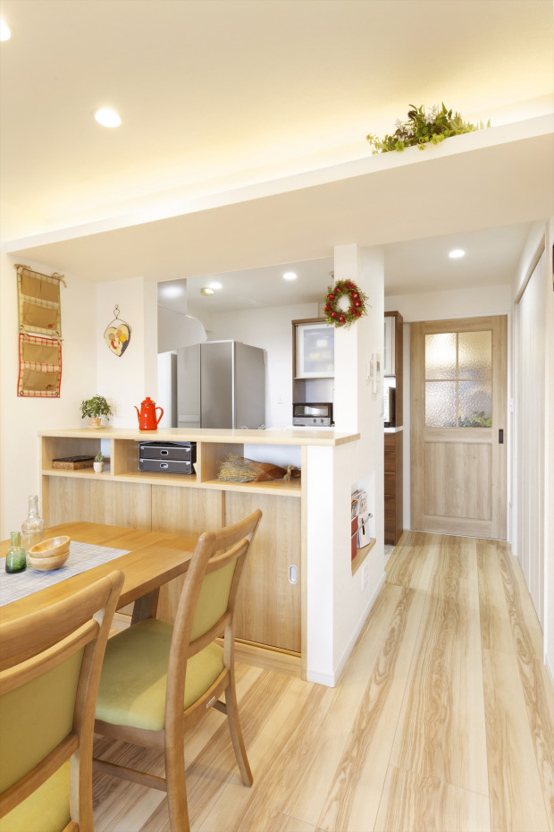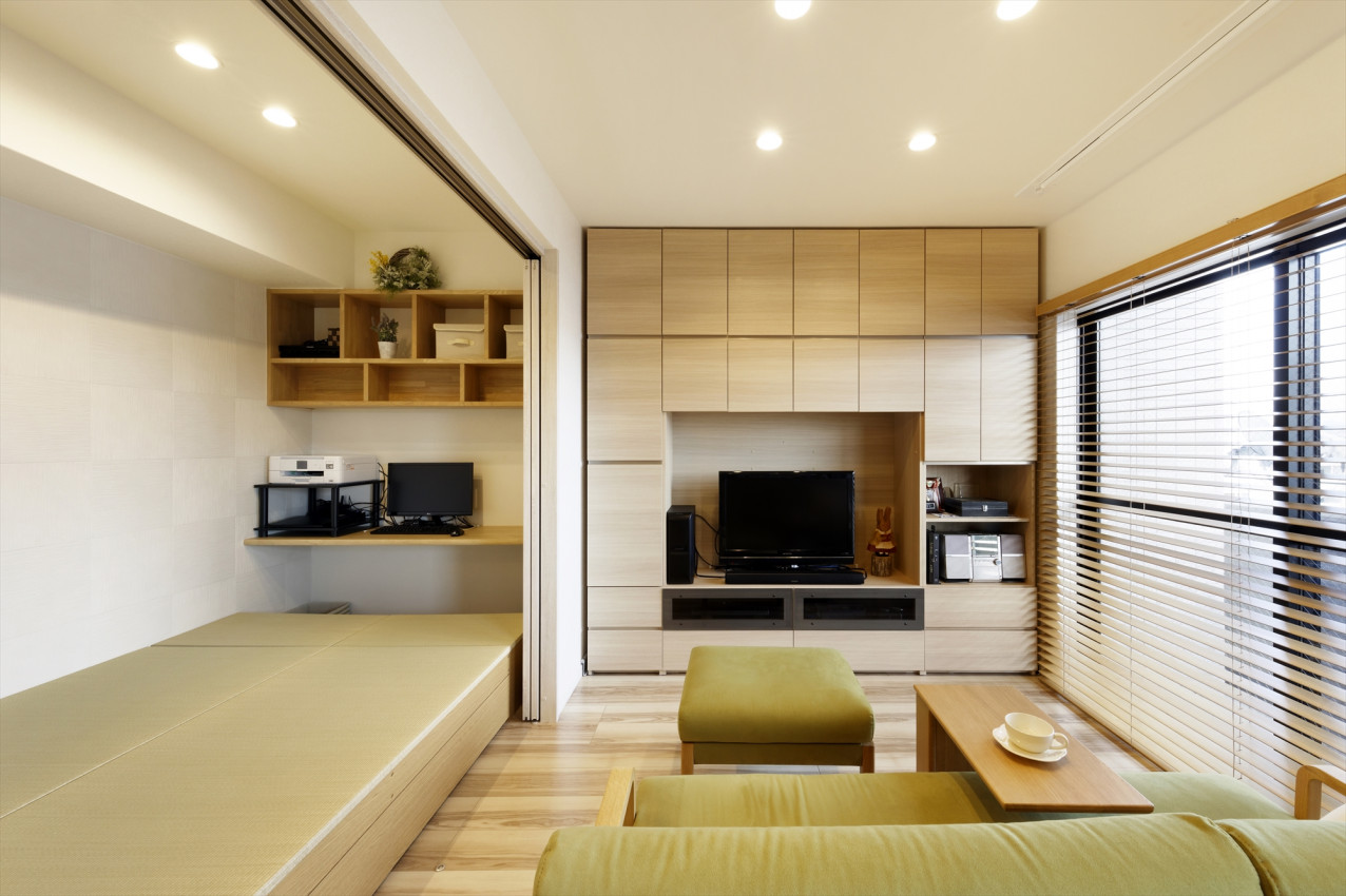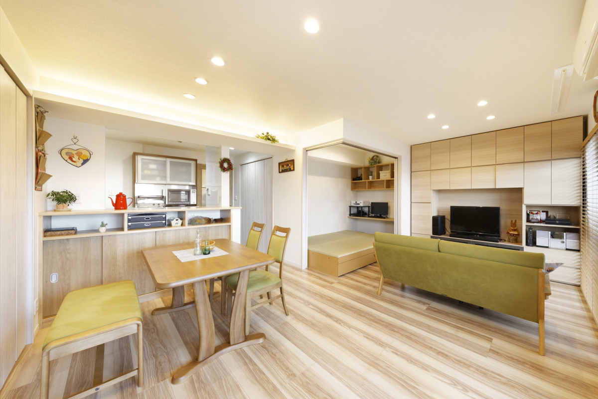 【畳コーナー】LDKの一角に畳コーナーを設けました。扉を取り付け、普段は扉を開けてLDKの一部として、息子様が来られた時は来客用の部屋として使い分けできる空間に。