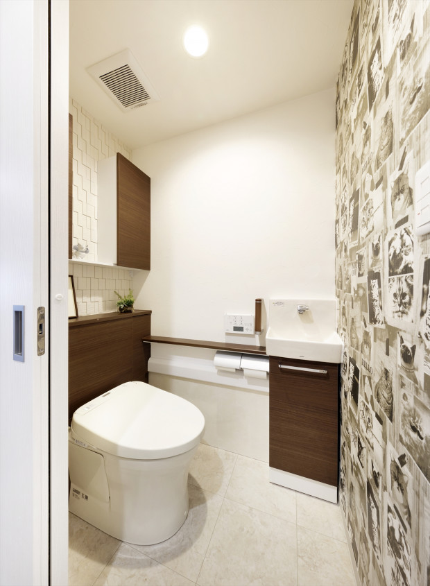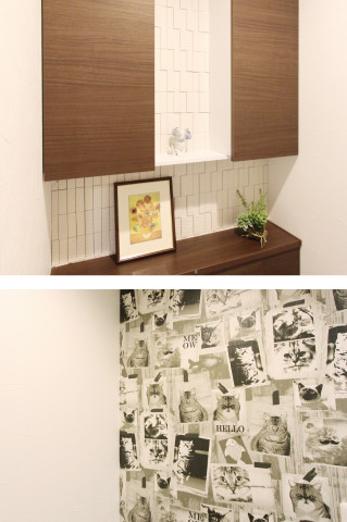 【トイレ】トイレの背面壁にもエコカラットを採用。反対側には猫の写真のクロスを貼りました。猫好きのご夫婦のこだわりが光ります!