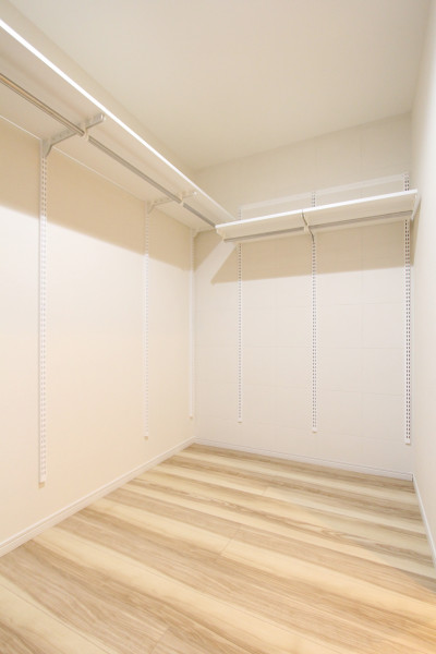 【ウォークインクローゼット】主寝室の横には可動棚を取り付けた大容量のウォークインクローゼットを。パイプ高さを自由に変えられます!