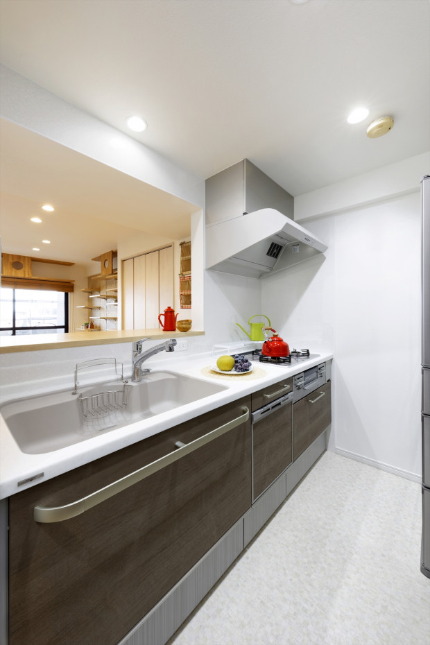 【キッチン】場所は変えず新しく生まれ変わったキッチン。吊り戸を無くしたことで開放的になりました。