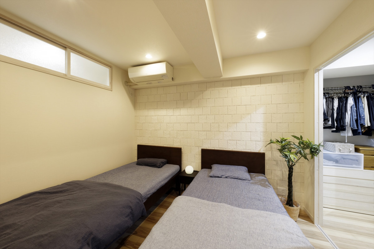 【主寝室】お困りであった結露対策として、調湿効果もあるエコカラットをご提案。玄関とつながる室内窓も設け、寝室に光と風を通します。