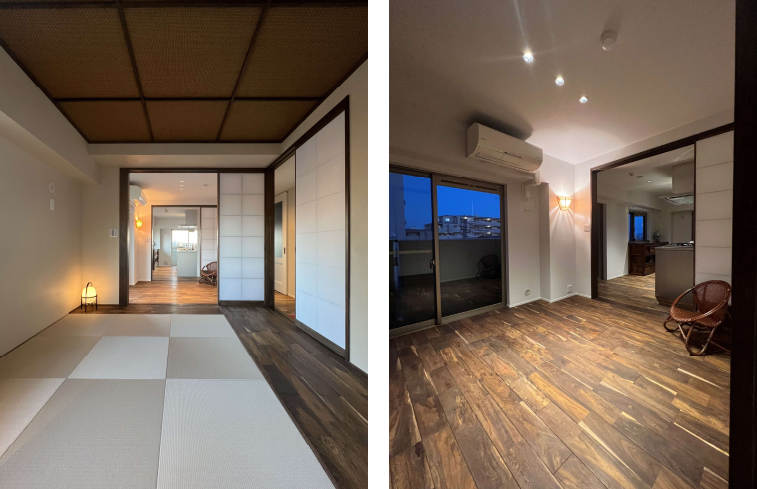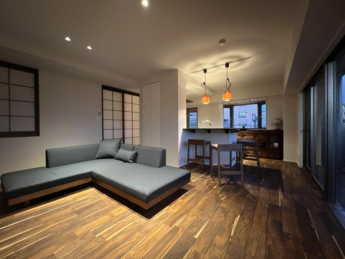 また、組子パネル・ペンダント照明からの間接光や土間の洗い出し仕上と床材・造作材との