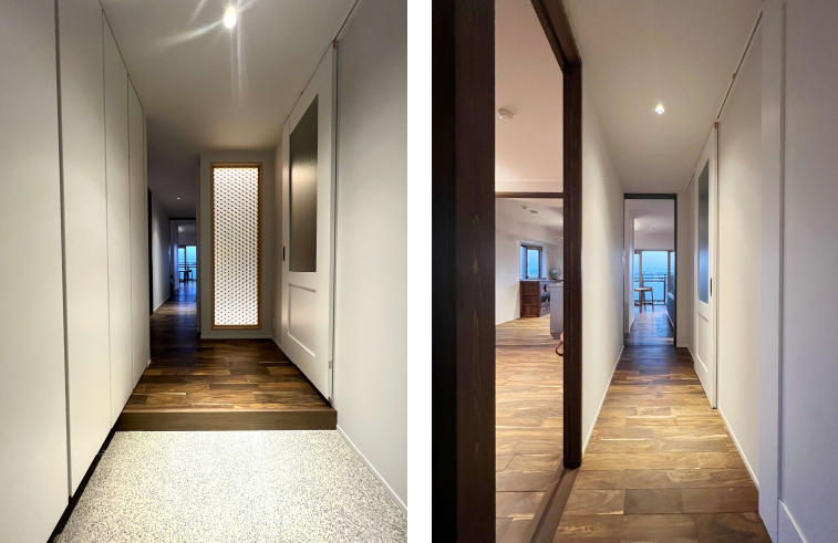 閉塞的な廊下とならないように視野の抜けを意識した空間構成としました。