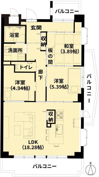 玄関から廊下にかけてはホール部分を拡張すると共に収納を確保し、縁側や和室、寝室、LDKとのつながりを持たせ、