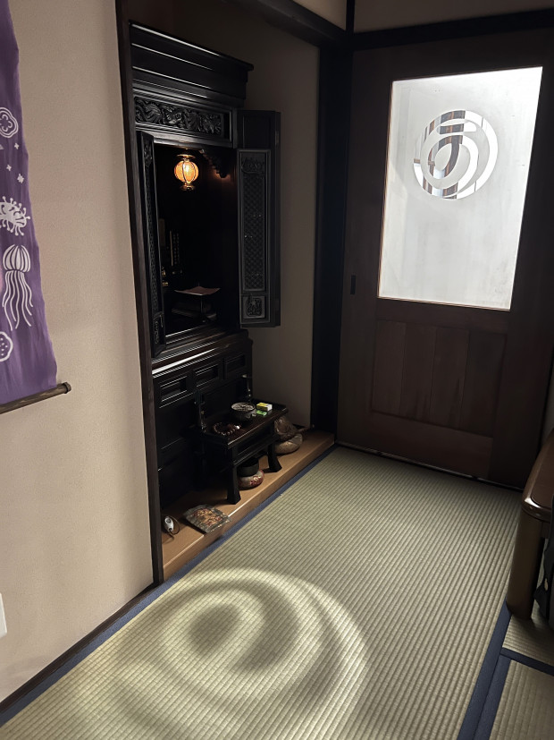 ホールからの光で和室の畳に浮かび上がる屋号の文字は、特にお気に入りポイントです。