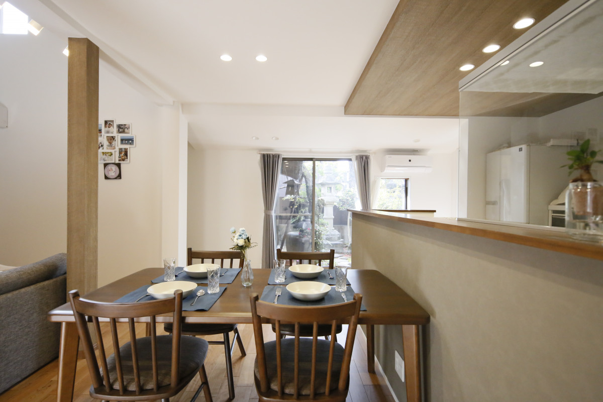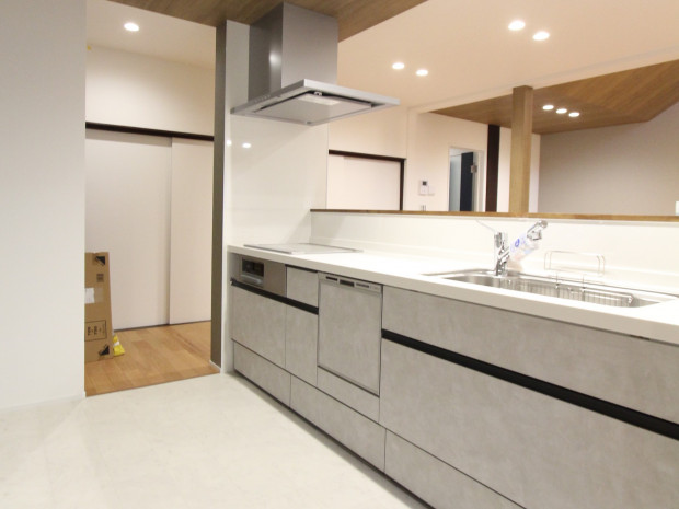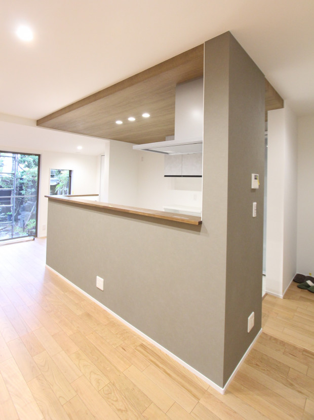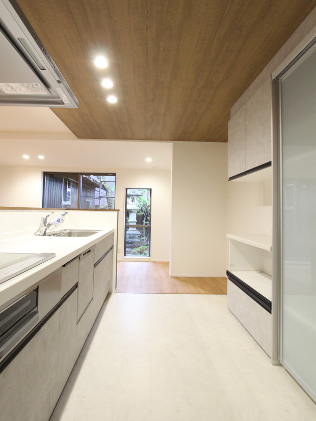 壁に囲われていたキッチンは奥様念願の回遊できる対面キッチンとし、より開放感を感じていただけるように、コンロ前は耐熱の透明ガラスでリビングの様子を伺いやすいよう配慮しました。