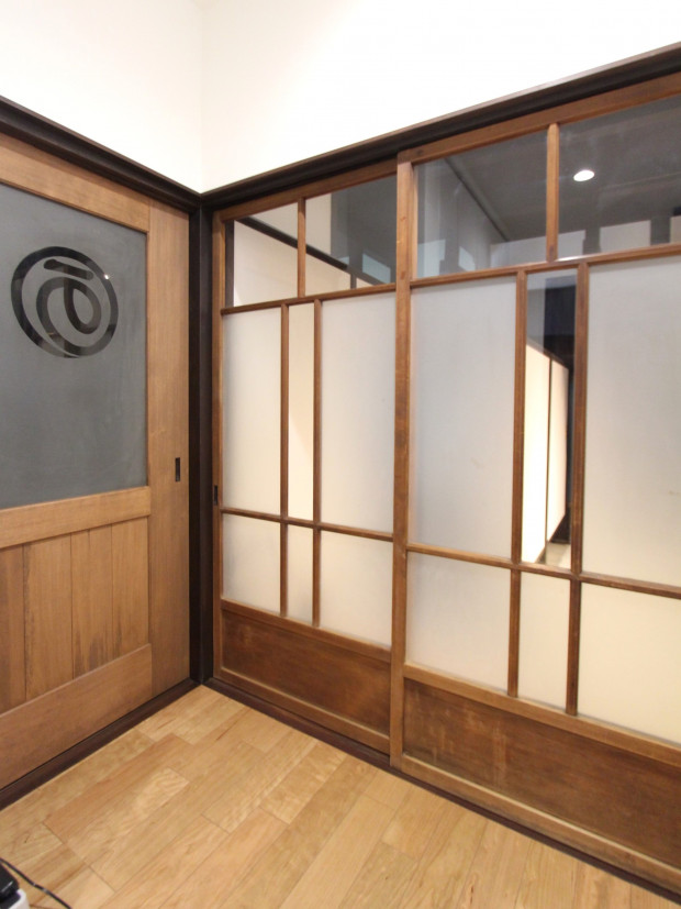 屋号が入ったガラスをどこかに再利用したいというM様のご希望を叶えるため、和室入口の建具に再利用しました。
