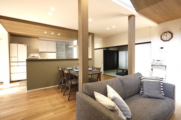 ・真ん中の構造上抜けない柱は木目のクロスでアクセントとし、ナチュラルな雰囲気にしました。