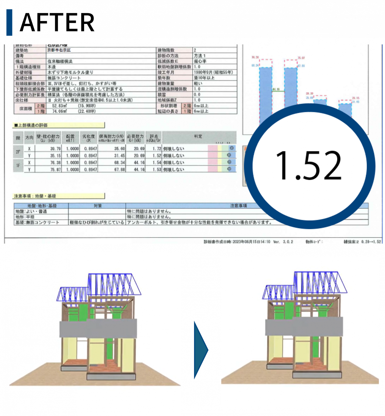 補強後(評定1.52(等級3))は、地震に強く、安全性の高い住宅へ生まれ変わりました!
