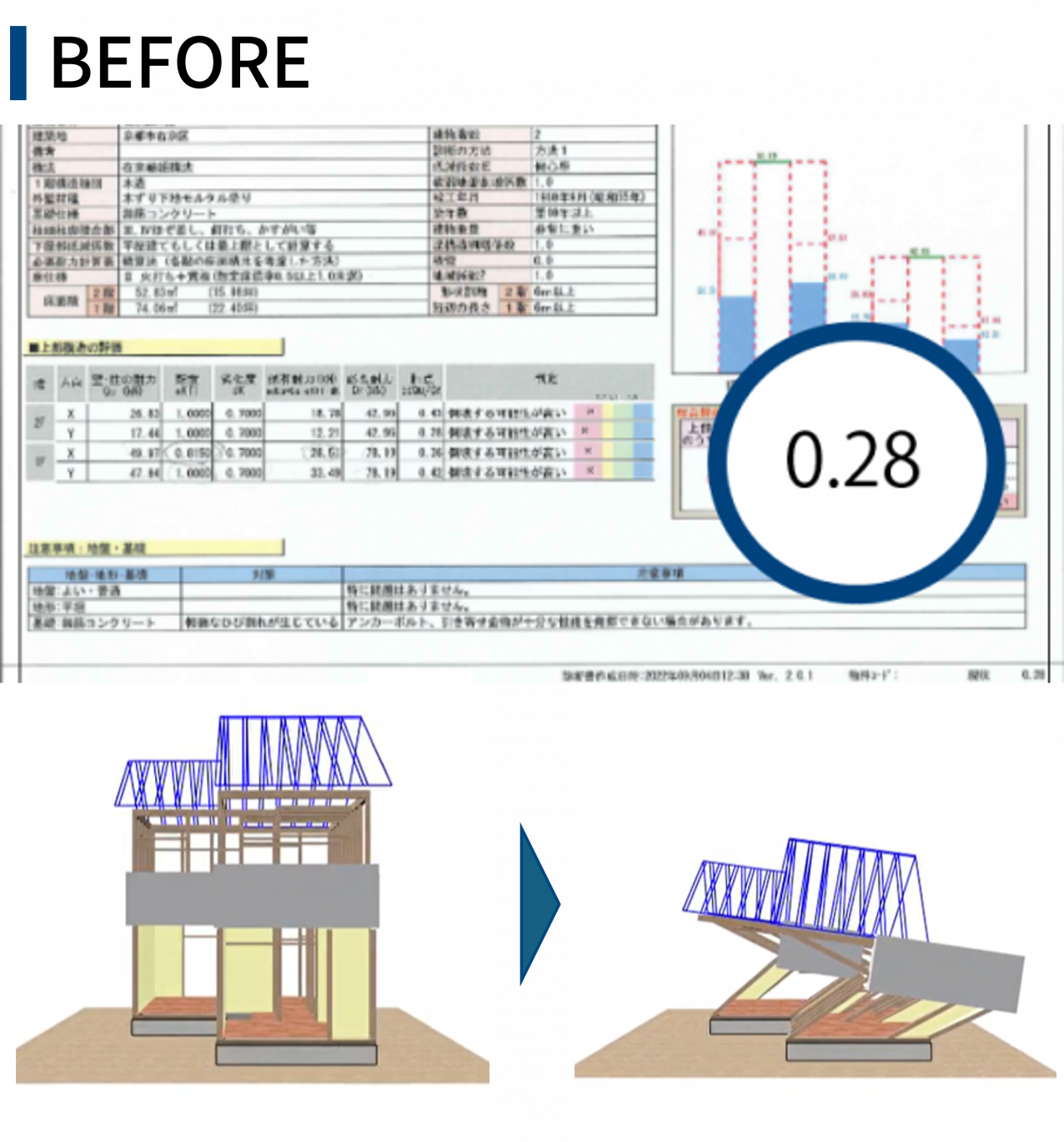 補強前(評定0.28)は、大地震で倒壊する可能性が極めて高い状態でしたが、
