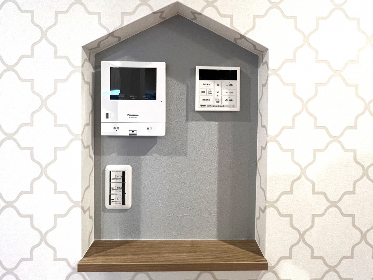 壁のニッチもリビングのアクセントクロスと揃えて空間に統一感がでるよう工夫しました。