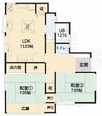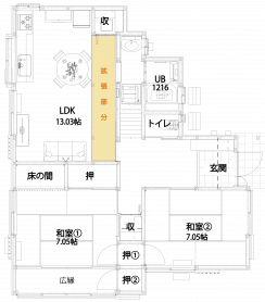 LDKを遮っていた壁を取り壊した事でLDKが広がり、13.03帖の広さを実現することができました!