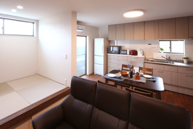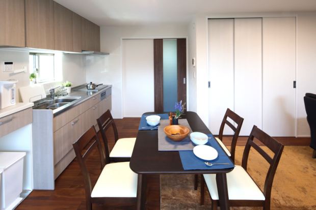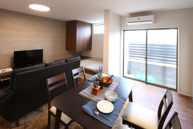 LDKは、床はウォールナットを使用し、キッチンやタイル調のアクセントクロス、畳等には、グレーをアクセントに空間をまとめました。