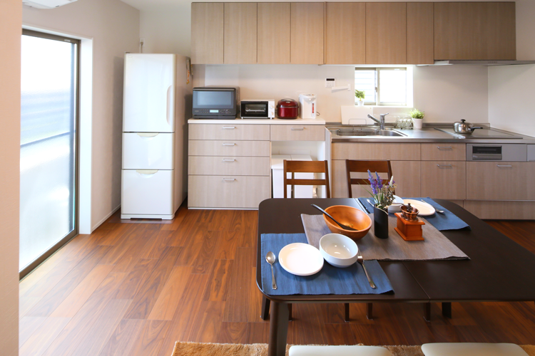 食器棚+家電収納を横並びにすることで使いやすく、またメーカーを合わせて、統一感のある空間になりました。