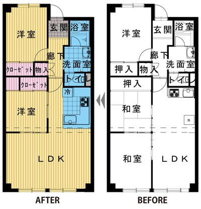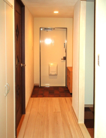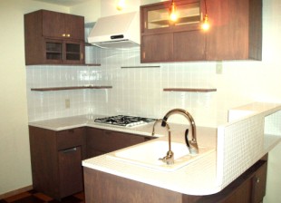 ■施工内容 /キッチン:セクショナル(I型)→木製の造作キッチン(L型) /天井・壁:トイレ一部→INAXエコカラット、その他の箇所→全面珪藻土 /床:玄関・廊下・トイレ→タイル /洗面所・キッチン一部→コルクタイル、その他の部屋→桐フローリング /建具:全て木製造作