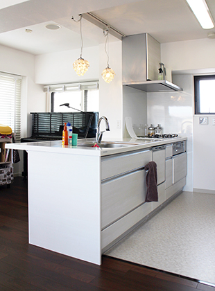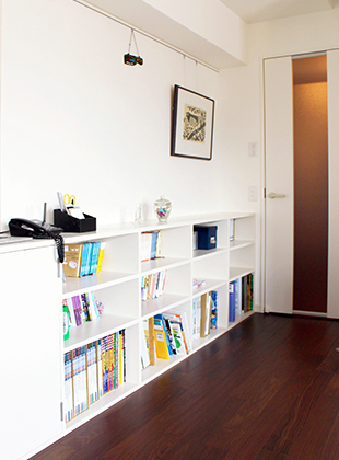 インナーサッシと遮光性のあるブラインドをご提案。白のインナーサッシをつけることで、暑さも防げてN様のお好きなすっきりとしたインテリアになりました。視界が遮られていたキッチンはフラットの対面にし、光がたっぷり入る明るい空間に。また、ご家族の人数に合わせて収納や本棚を造り、お部屋をきれいに保てるようになったと喜んで頂けてとても光栄です。