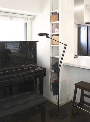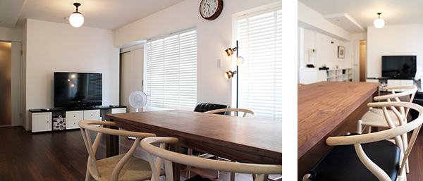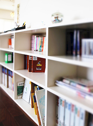 和室をなくしてリビングを広くすることは想像していたのですが、家族の人数に合わせた収納や本棚を提案して頂き、床にモノを置かなくなり掃除もしやすくなったので綺麗に保てて嬉しいです。天井にはスピーカーを埋め込んで頂いたので、広いLDKはいつも音楽の流れるカフェのような空間になりました。