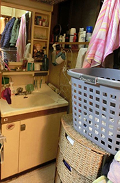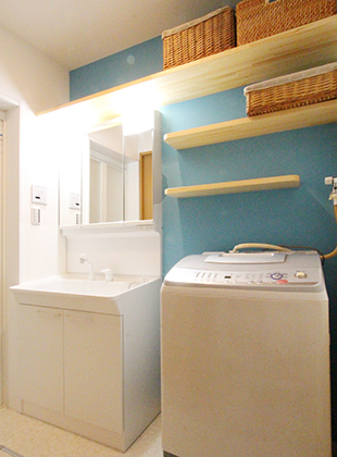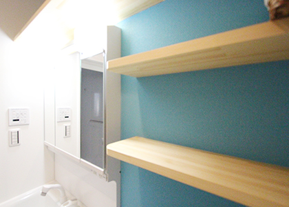 収納棚を造作して、タオルのストックや洗剤をすっきりと置いておけるようにしました。
