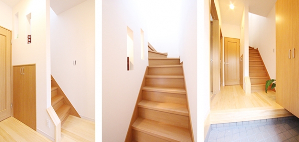 (写真中)階段にも明るさを確保するために壁に開口をご提案。小物を飾っておくことも出来ます。