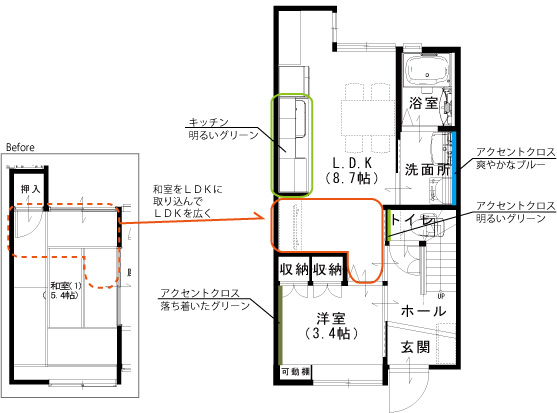空間を広く見せることができ、日々の生活が楽しくなるようにと、アクセントクロスをご提案。奥様が気に入って下さり、要所要所にカラーを取り入れた空間になりました。