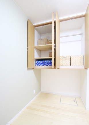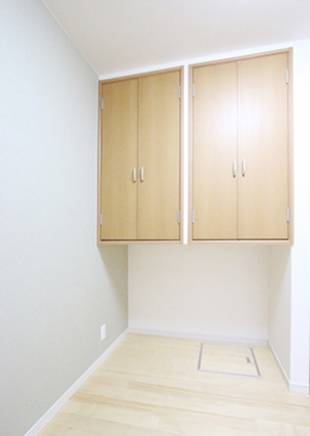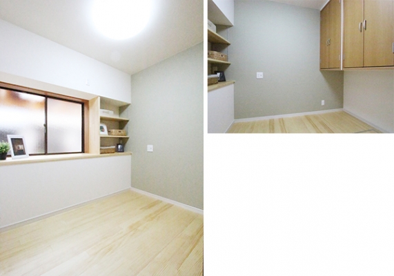 出窓の一部に棚を造作したり、吊戸棚を設けることで、すっきり収納して頂くことができます。