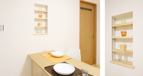 収納を確保するために、ダイニングには壁の厚みを利用してニッチを設けました。調味料を置いての収納スペース、写真立てを置いて空間の演出スペースと、様々な用途にお使い頂けるよう可動をご提案。