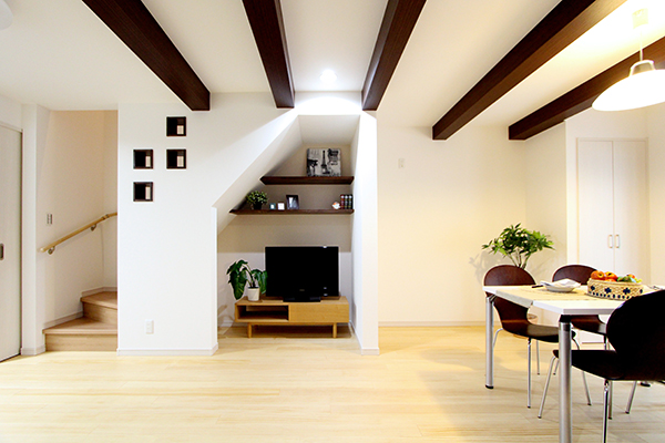 【リビング】ご友人がコーヒーを飲みに遊びに来ていただけるような温かいスペースに。アクセントの梁はS様のお気に入り。