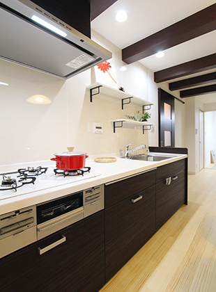 【キッチン】見せる収納として飾り棚を設けたシステムキッチンに。梁を活かした空間にしました。